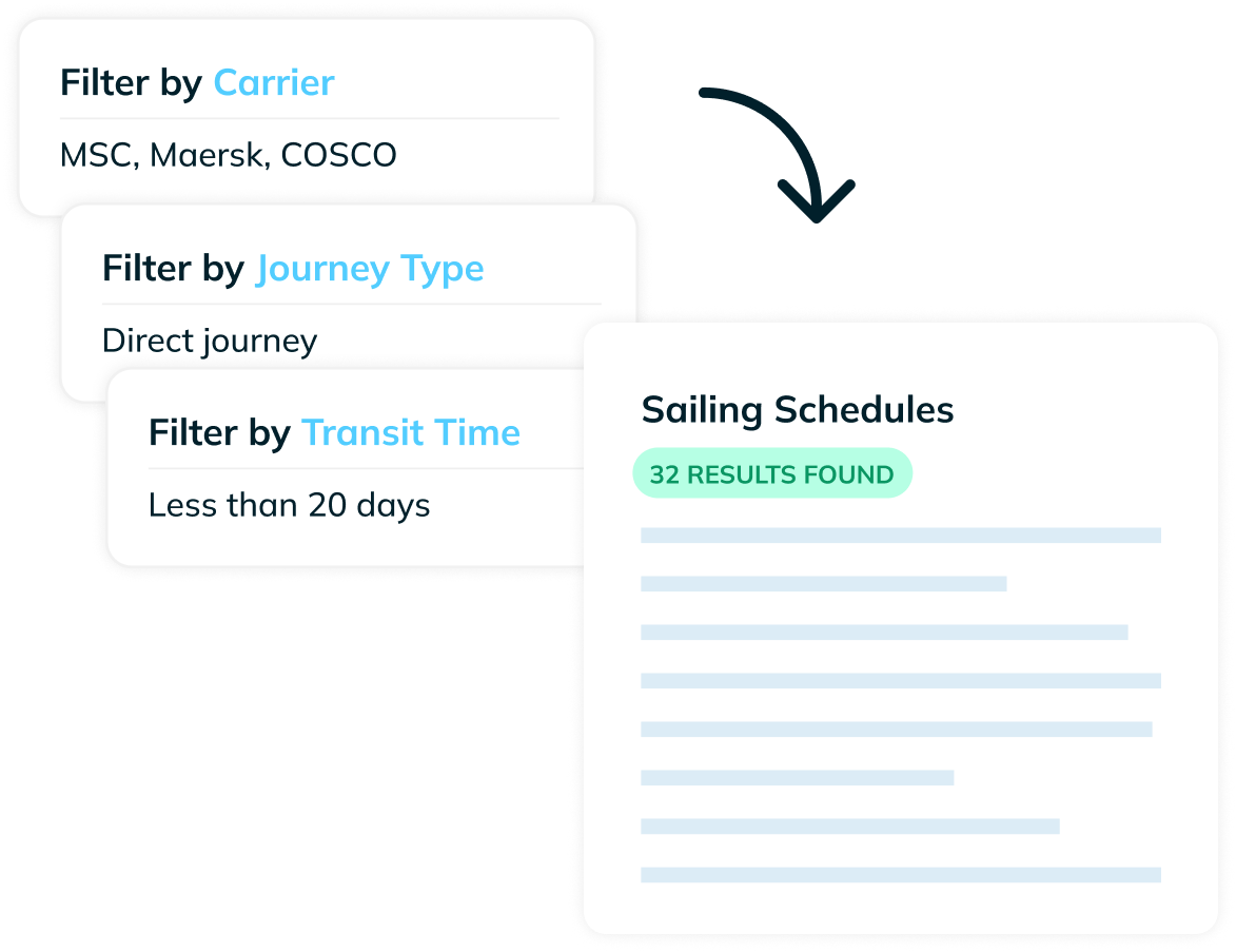 Compare sailing options, refine results with filters, and export or integrate data via the platform, API, or embedded dashboards.
