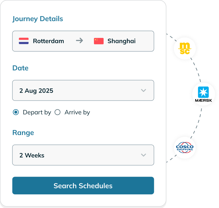 Access frequently refreshed schedules from 35+ carriers and over 420,000 port pairs in one place.